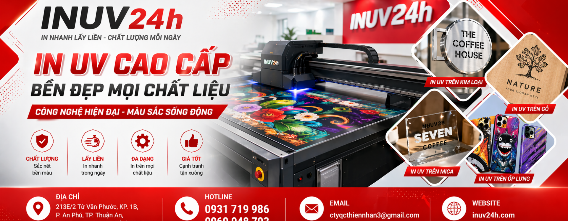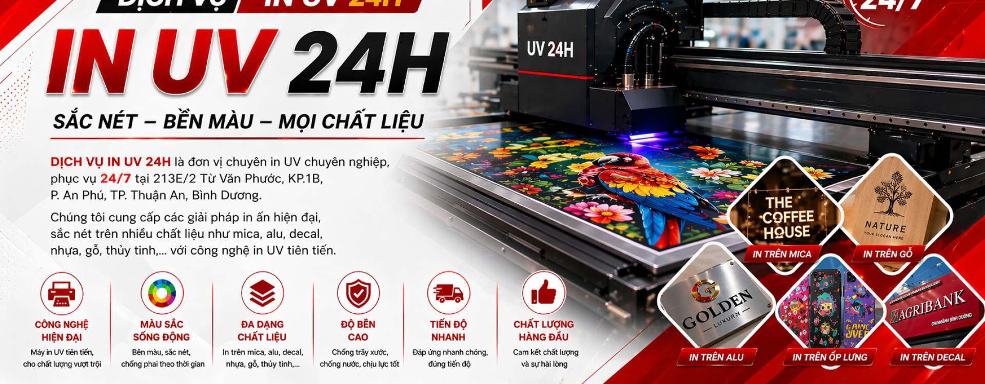 DỊCH VỤ IN UV 24H là đơn vị chuyên in UV chuyên nghiệp, phục vụ 24/7 tại 213E/2 Từ Văn Phước, KP.1B, P. An Phú, TP. Thuận An, Bình Dương. Chúng tôi cung cấp các giải pháp in ấn hiện đại, sắc nét trên nhiều chất liệu như mica, alu, decal, nhựa, gỗ, thủy tinh,... với công nghệ in UV tiên tiến.